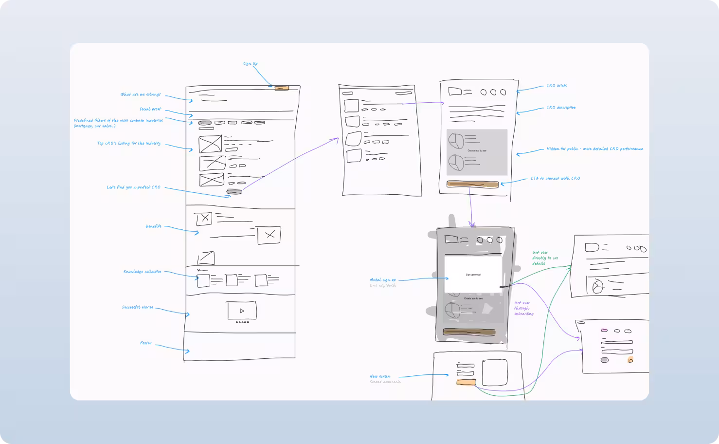 We started with comprehensive discovery research, interviewing real estate professionals and credit repair organizations to understand their workflows, pain points, and requirements.
