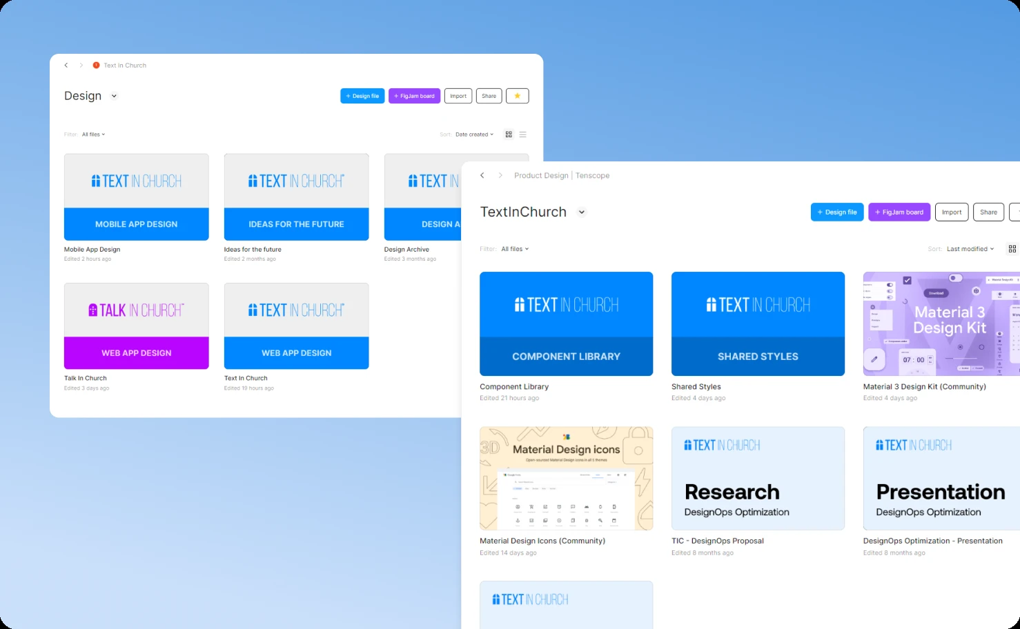 Then came the restructuring. The previous approach—everything dumped into one giant file—was replaced with a logical folder system: Text in Church (main platform), Talk in Church (communications module), Component Library (design system), Mobile App Design (native apps), and Archive (historical reference).