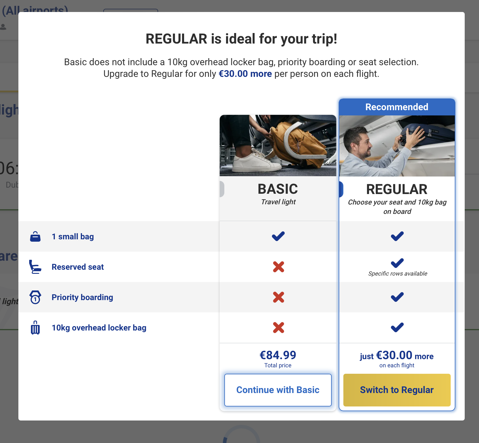 Airlines interrupt your booking flow with full-screen prompts that aggressively push upgrades by making your original choice look inadequate. These pop-ups highlight everything you'll "miss out on" with the basic fare using red X's and negative language, while making the upgrade option look appealing with bright colors, checkmarks, and "Recommended" labels.