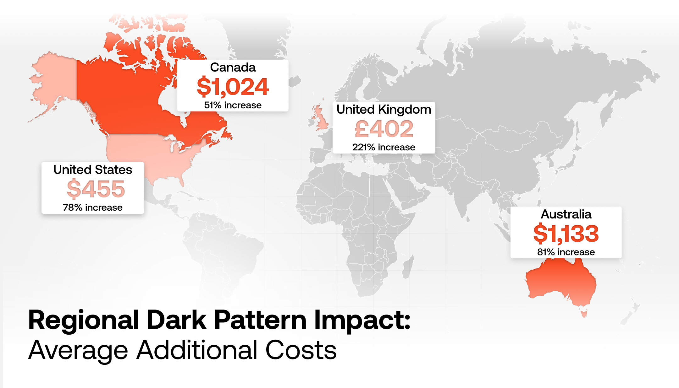 - United States: Travelers pay an average of $455 extra (78% increase) due to dark patterns, with routes like Chicago-Miami seeing increases up to $1,000 on American Airlines